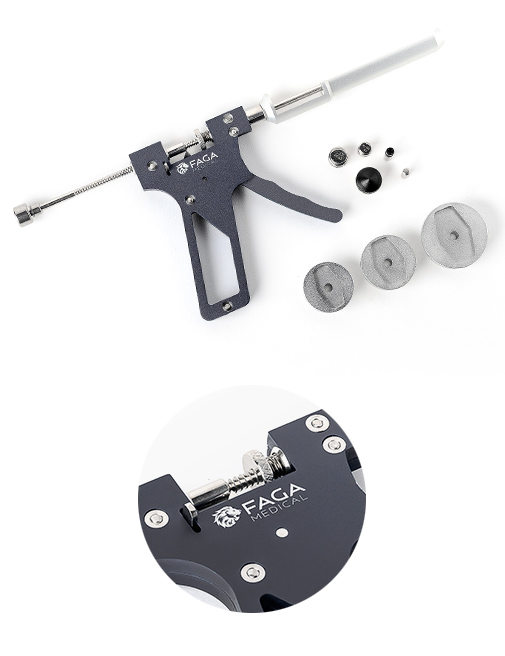Totalmente desmontável e ajustável, tem como diferencial a ergonomia, conforto, segurança e precisão nas injeções de lipoenxertos e preenchedores.